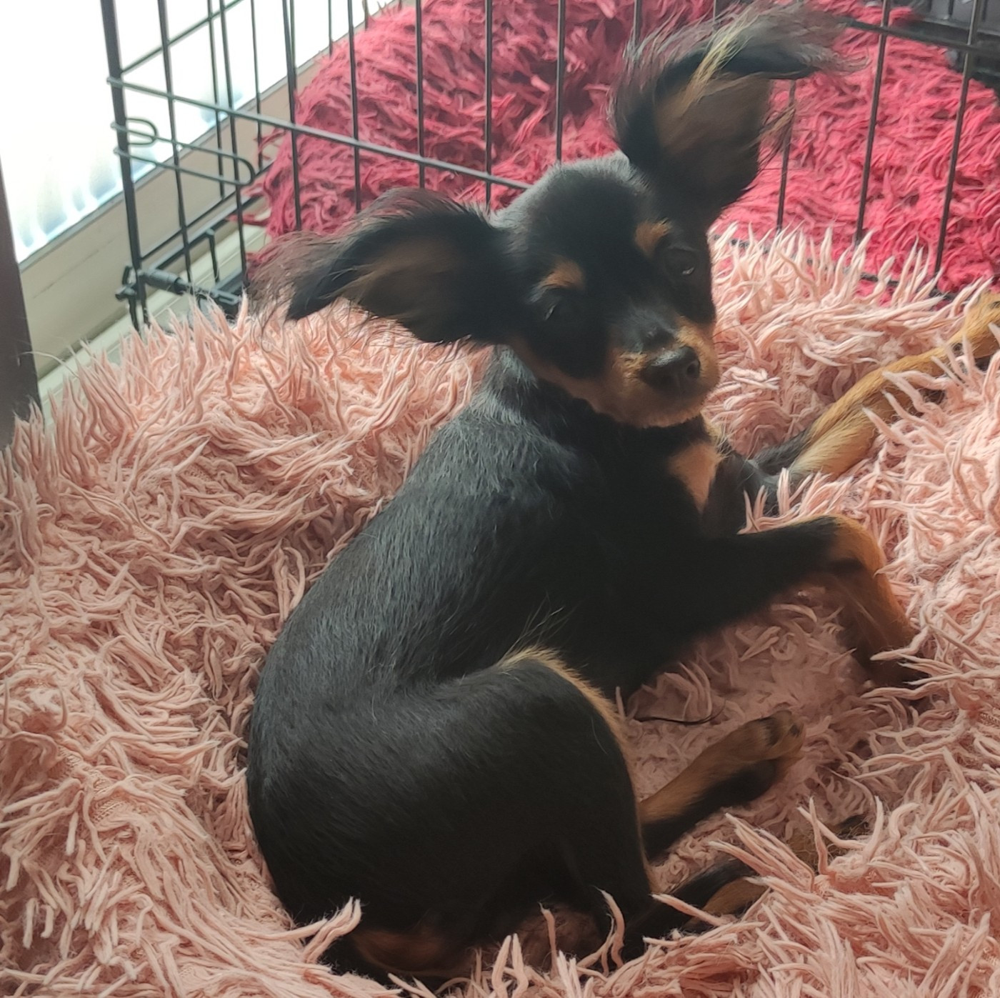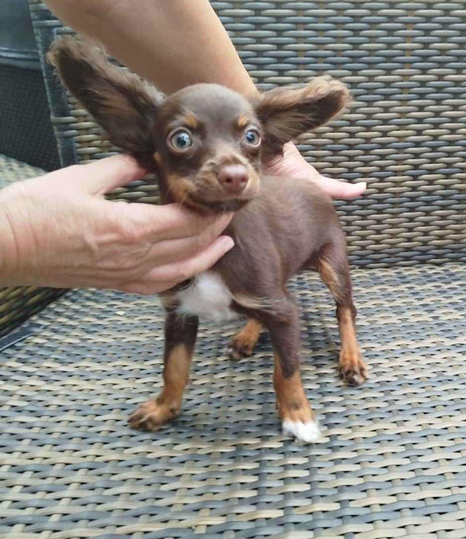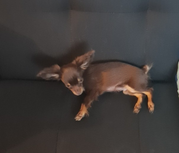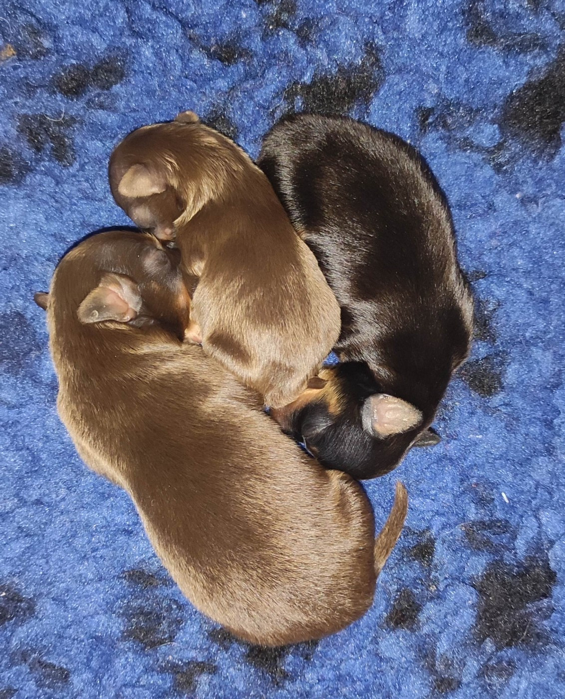 Bébés de Témy Gestation à terme Deux chiots chocolat et un noir et feu Arya, 3 mois et demi Agni 4 mois Arthur, 3 mois